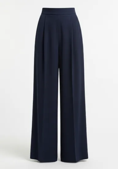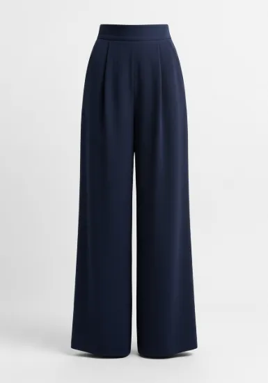 Şık ve rahat yüksek bel kesim, dökümlü wide leg pantolon. Günlük ve ofis kullanımına uygun.
